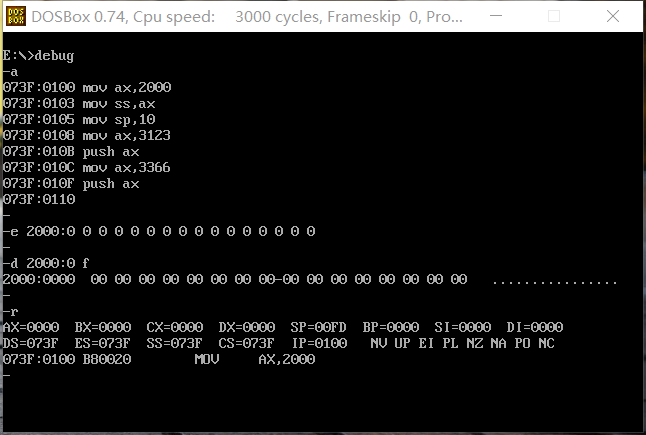 1. 熟练掌握使用debug工具编写和调试汇编命令的方法 2. 理解并掌握内存中多字节数据的存放 3. 理解并掌握「栈」内存空间的特性和使用 4. 理解并掌握8086汇编指令mov, add, sub, push, pop的用法
