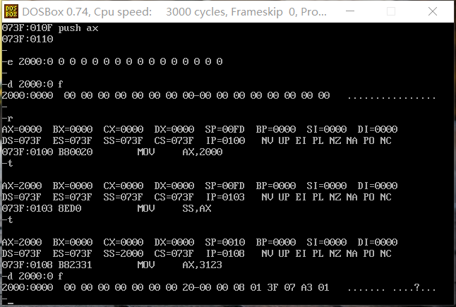 1. 复习第 3 章「栈」的知识:栈的特性、寄存器 SS 和 SP、指令 push 和 pop 2. 完成教材 3.6~3.9 节内的问题 3.6~3.12,检测点 3.1~3.2 3. 结合教材实验1 (P35)及公邮文件中心→实验下的 “实验1辅助文档.pdf”复习debug 工具用法。