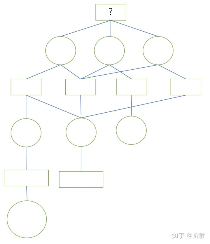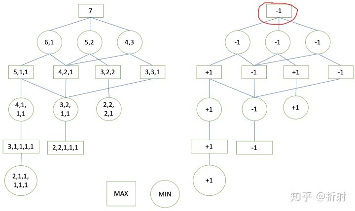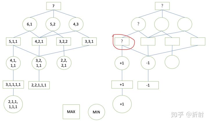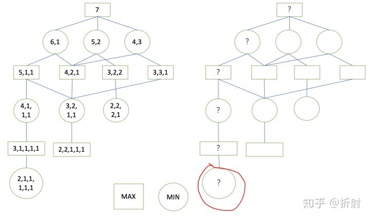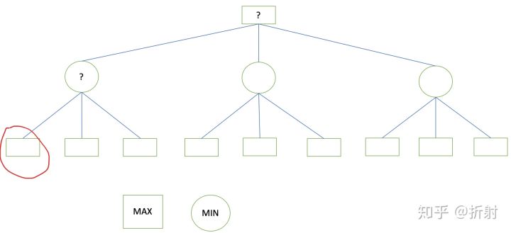 首先,我们穷举所有的可能的状态。用矩形代表轮到我方做决策的极大层节点,用圆形代表轮到对方做决策的极小层节点,列举出所有的状态: