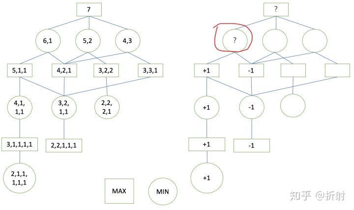 考虑两个游戏者:MIN和MAX,MAX先行,然后两人轮流出招,直到游戏结束。在游戏最后,给优胜者积分,给失败者罚分。