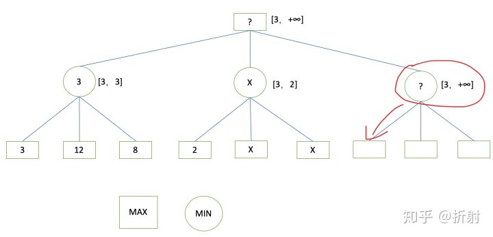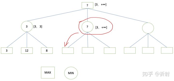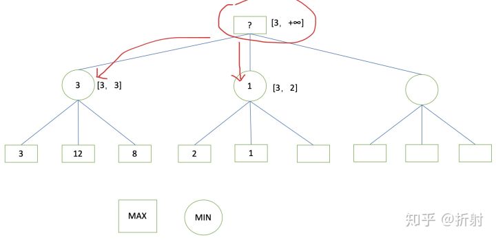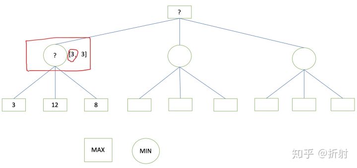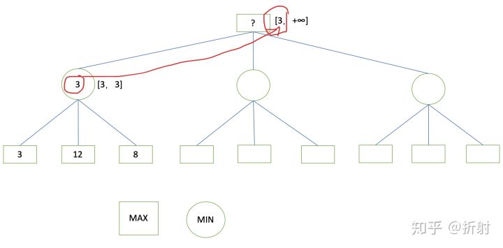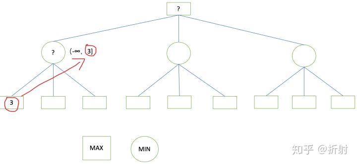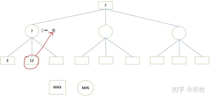 现在仔细想想,如果我们继续获得它的子节点的收益,为一个比3要大的值,假设为12好了。那么当前的父节点,必然不会选择这个12,而会去选择3。因此,这个父亲节点的收益,无论如何,都不会超过3,那么它的取值范围,我们可以认为是:(-∞,3]。也就是说,我们的子节点,其实更新了它的父节点的收益的一个上界值,如图: