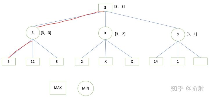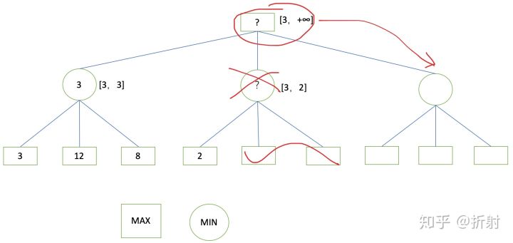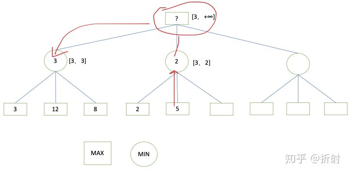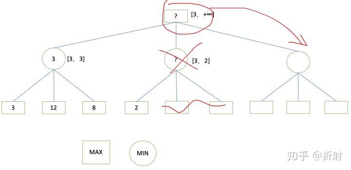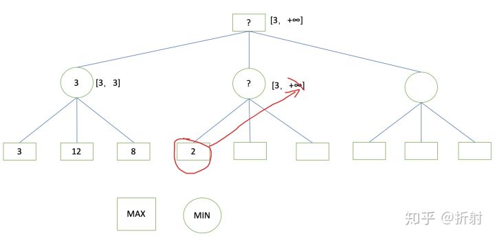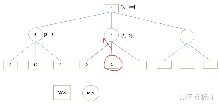 我们知道,当前子节点是一个收益为2的MAX节点。MAX节点可以更新父节点的上界。因此,父亲节点的上界,被修改成了2。 这里就出现了一个矛盾的区间[3,2],如下图: