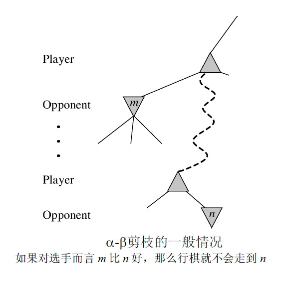 α-β剪枝可以用于树的任何深度,而且很多情况下可以剪裁整个子树,而不是仅剪裁叶节点。一般原则是:考虑在树中某处的节点n,游戏者可以选择移动到该节点。如果游戏者在n的父节点或者更上层的任何选择点有一个更好的选择m,那么在实际的游戏中就永远不会到达n。所以一旦我们发现关于n的足够信息(通过检査它的某些后代),能够得到上述结论,我们就可以剪裁它。