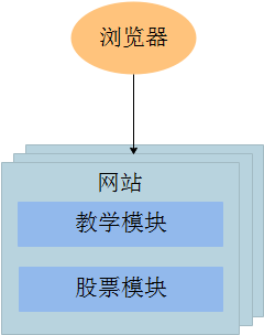 扩容造成的资源浪费。模块和模块之间的访问量是不同,比如教学模块和股票模块,由于教学模块主要是面向教师进行一些管理操作,而股票模块会有更多的学生参与交易操作。简单的讲,那么我们可能需要9台机器来部署股票模块,1台机器来部署教学模块。但是呢,我们需要把整个应用一起扩容,下面灰色部分其实是多余的模块,白白消耗了机器的资源。