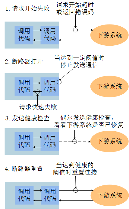 使用断路器时,当对下游资源的发起的请求连续失败过多,达到阈值时,断路器会打开。