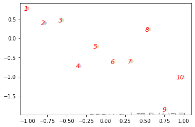 plt.text(x[i], y[i], i+1, fontsize=12, color = "r", style = "italic", weight = "light", verticalalignment='center', horizontalalignment='right', rotation=90)