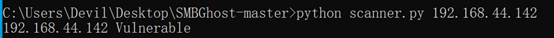 2、使用工具检测靶机是否存在漏洞,检测工具下载地址https://github.com/ollypwn/SMBGhost运行结果如下图,证明靶机存在此漏洞
