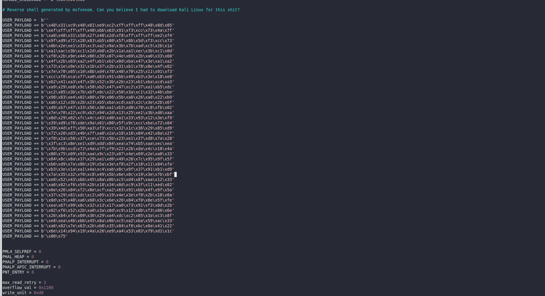 5、将msf中生成的exploit.py 生成的code,替换到poc下载文件中的exploit.py的USER_PAYLOAD参数,并把参数buf改为USER_PAYLOAD
