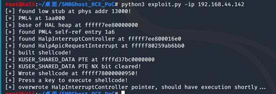 6、运行poc:python3 exploit.py -ip xx.xx.xx.xx (如果出现报错physical read primitive failed! 多运行几次)