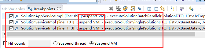 关注断点后面的[ ]中的内容,必须为Suspend VM类型的断点。
