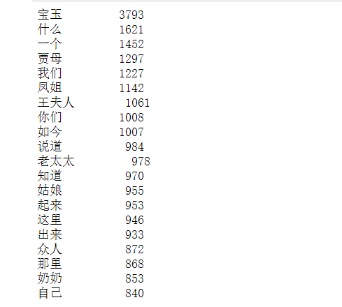 import jieba text=open('D:/红楼梦/红楼梦.txt',"r",encoding='utf-8').read() words=jieba.lcut(text) counts={} for word in words: if len(word)==1: #排除带个字符的分词效果 continue else: counts[word]=counts.get(word,0)+1 items=list(counts.items()) items.sort(key=lambda x:x[1],reverse=True) for i in range(20): word,count=items[i] print("{0:<10}{1:>5}".format(word,count))