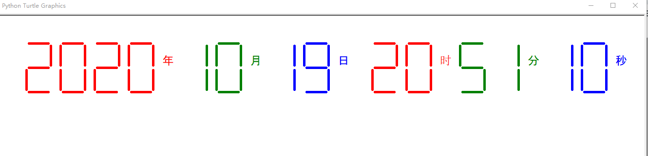 def main(): # 主函数turtle.setup(1600, 1000, 0, 0)turtle.penup()turtle.left(90)turtle.fd(200)turtle.right(90)turtle.fd(-600)turtle.pensize(5)drawDate(time.strftime("%Y+%m-%d*%H$%M&%S@", time.localtime()))turtle.hideturtle()turtle.done()