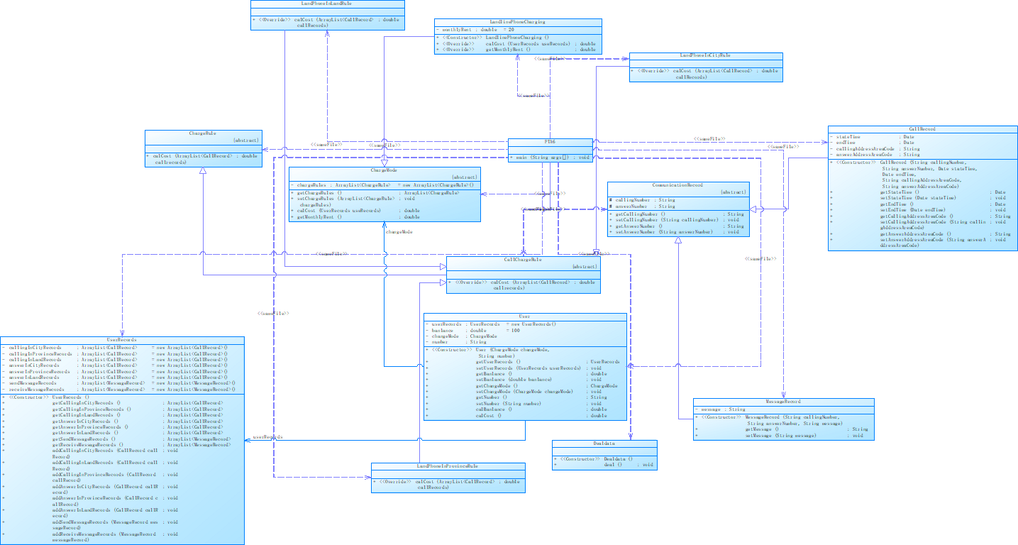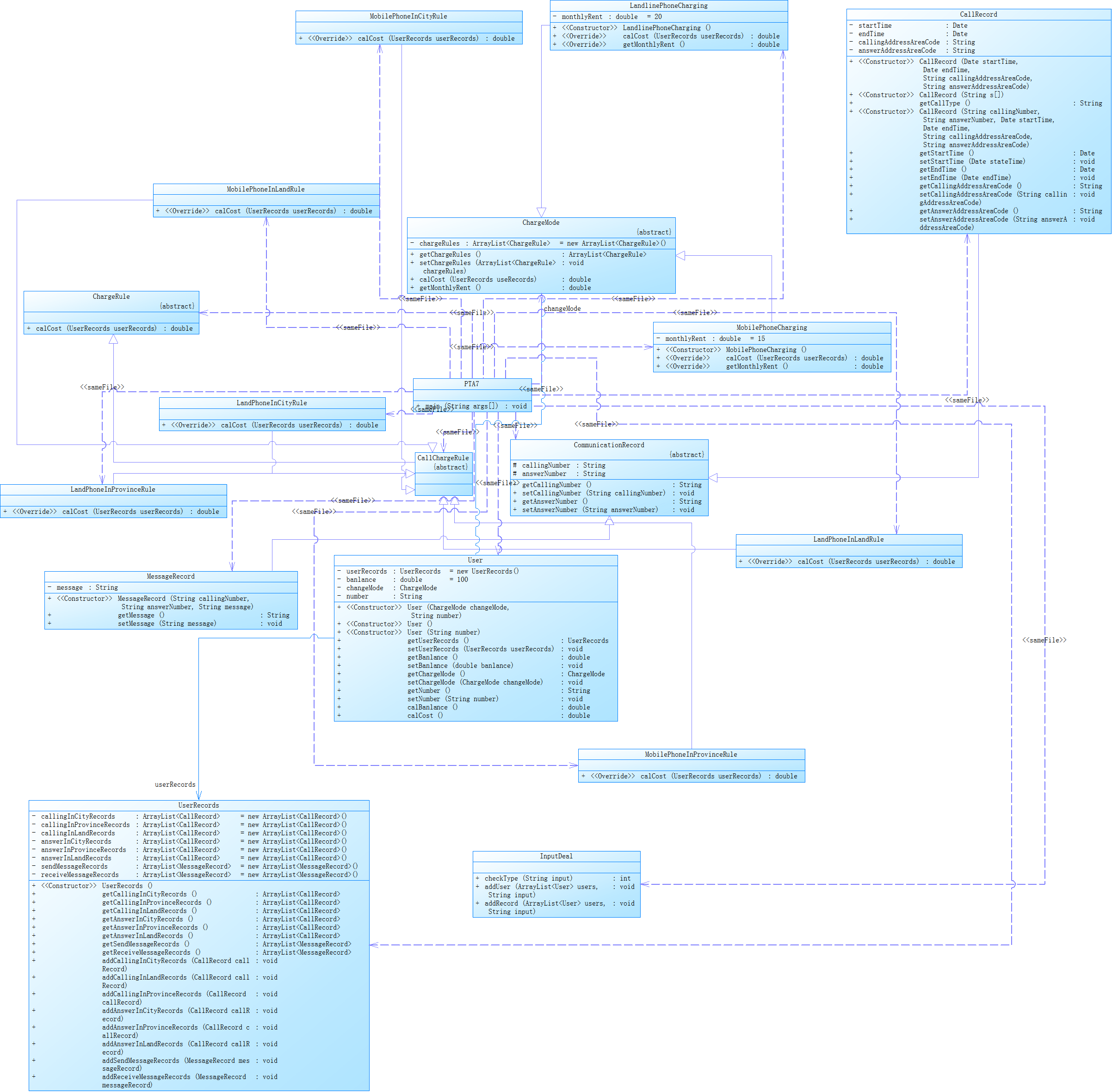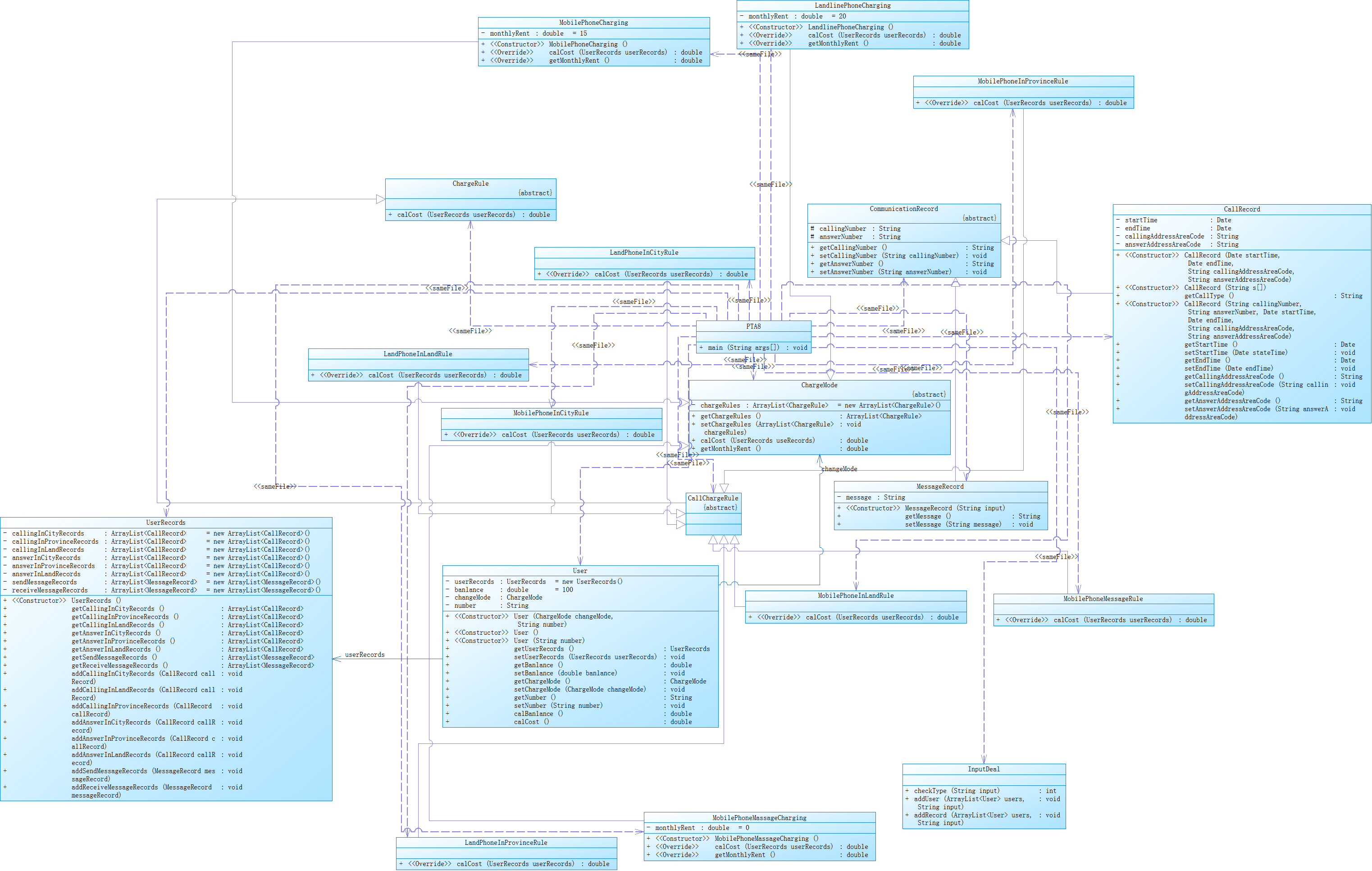图3 图3是计费规则的相关类,这些类的核心方法是: calCost(ArrayList<CallRecord> callRecords)。 该方法针根据输入参数callRecords中的所有记录计算某用户的某一项费用;如市话费。 输入参数callRecords的约束条件:必须是某一个用户的符合计费规则要求的所有记录。 LandPhoneInCityRule、LandPhoneInProvinceRule、LandPhoneInLandRule三个类分别是 座机拨打市内、省内、省外电话的计费规则类,用于实现这三种情况的费用计算。 (提示:可以从UserRecords类中获取各种类型的callRecords)。