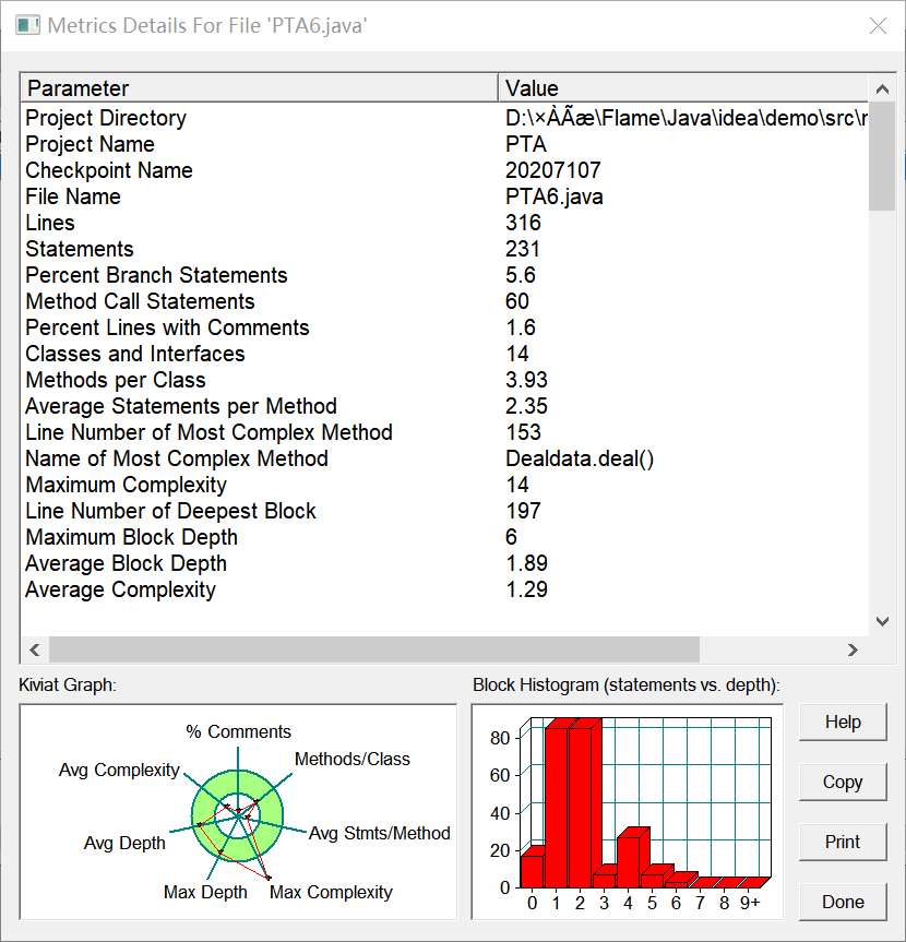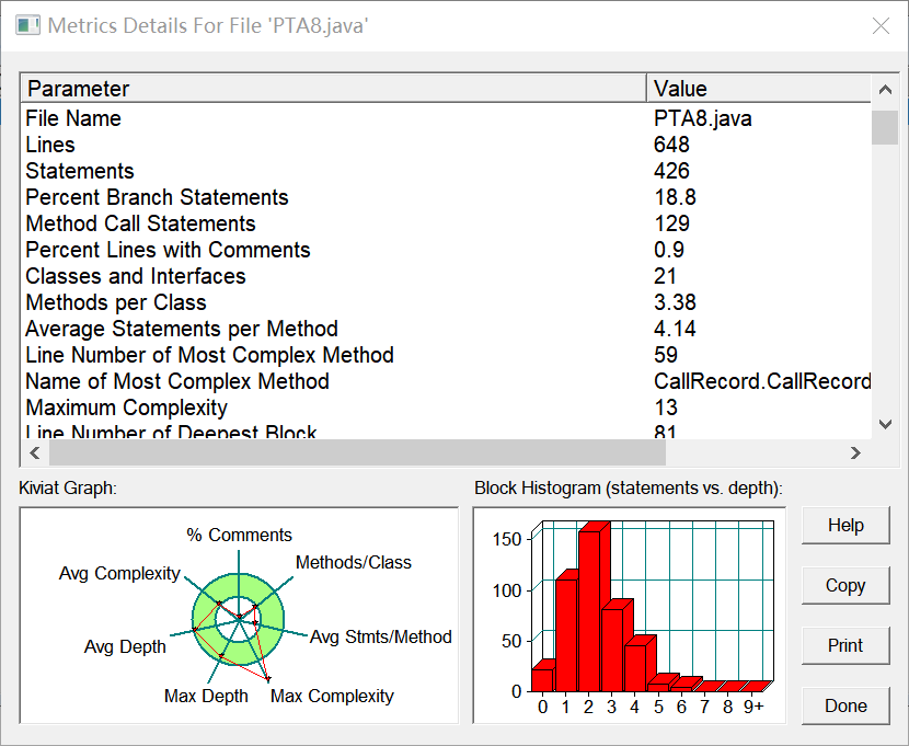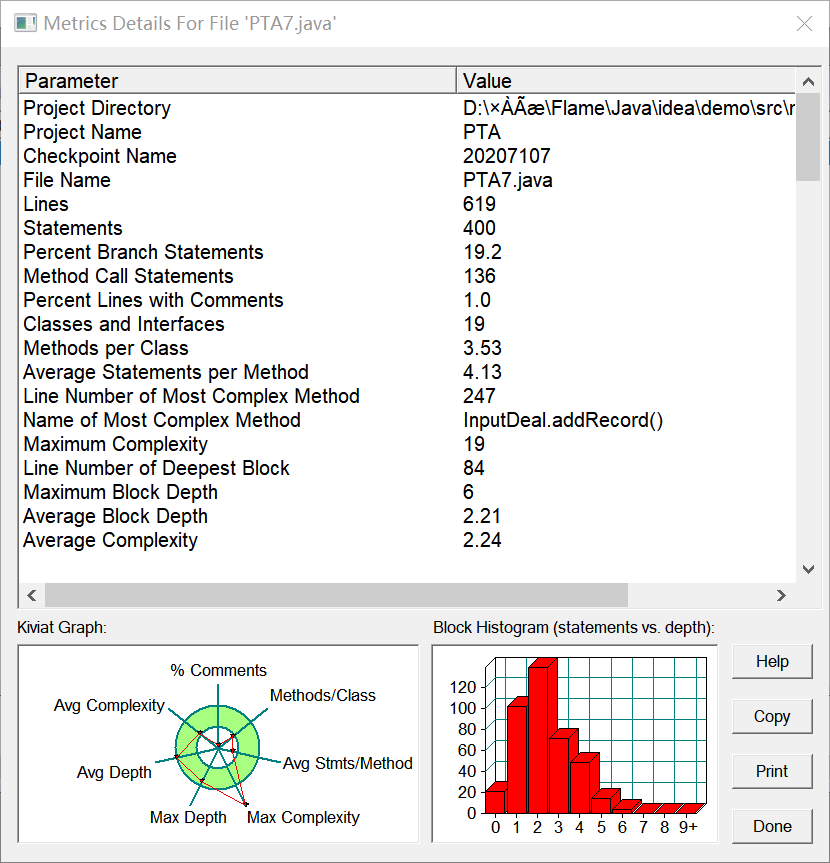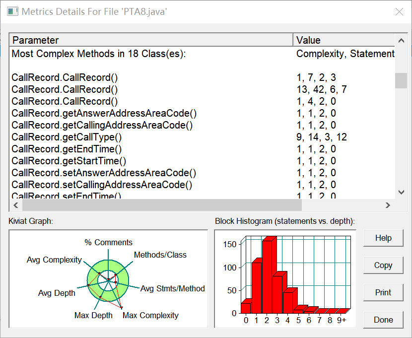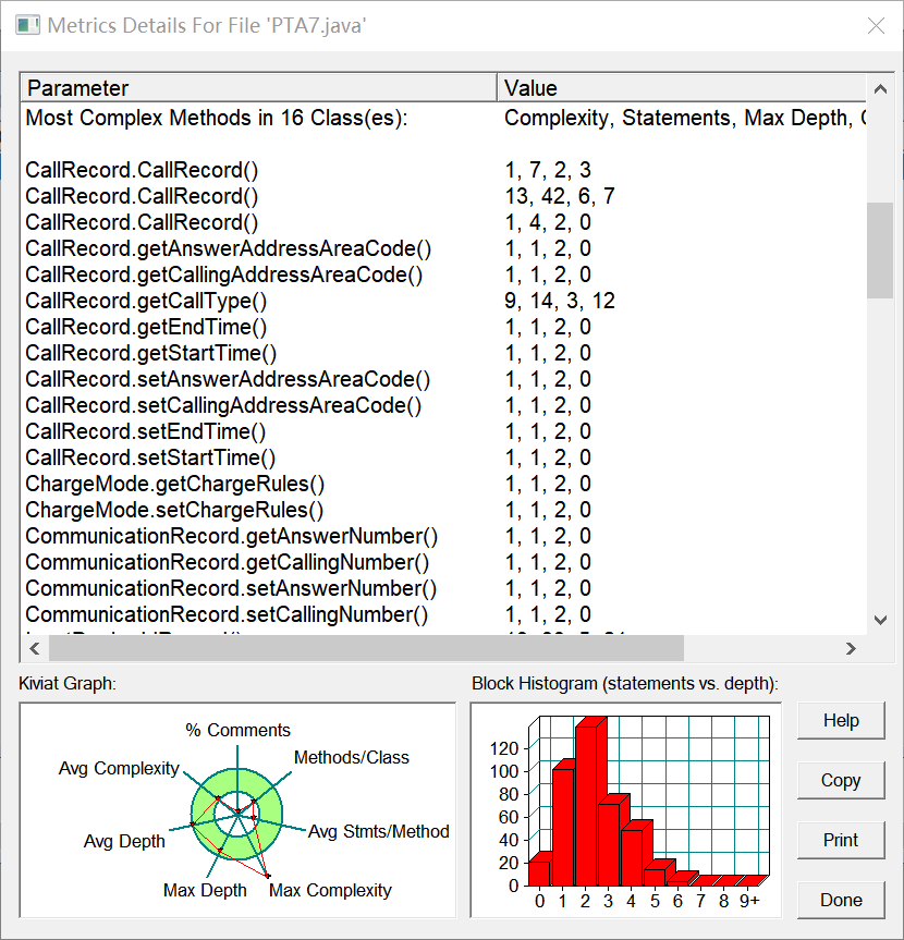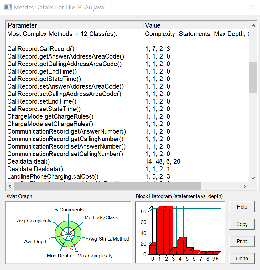 这次作业我只是在第二次的基础上增加了信息计费的规则以及修改了对于输入信息的处理,看SourceMonitor图分析,最大复杂度偏大,最大深度以及平均深度都在超出预期的边缘,说明有一部分的代码并不理想,存在优化修改的空间。