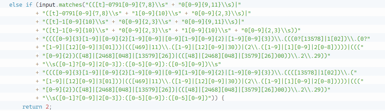 if (input.matches("[u]-0791[0-9]{7,8}\\s[0]") || input.matches("[u]-1[0-9]{10}\\s[13]")) {