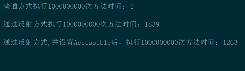 System.out.println("通过反射方式执行1000000000次方法时间:" + (endTime - startTime));