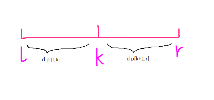 最后总会剩下两堆石子进行合并,那么就可以得到动态转移方程:
