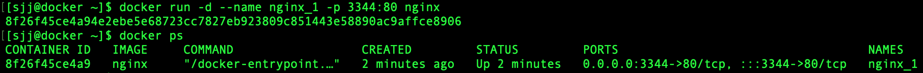 docker run -d --name nginx_1 -p 3344:80 nginx
