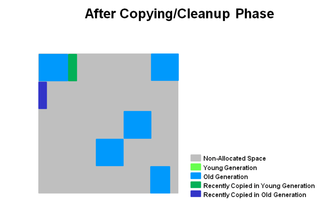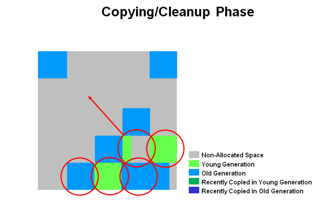 存活的对象被疏散(即复制或移动)到一个或多个幸存者区域。如果达到衰老阈值,一些对象将推广到老年代区域。