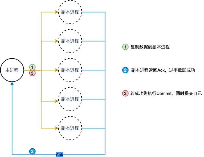 然后,根据所有 Follwer 的反馈,如果超过半数成功响应,则执行 commit 操作(先提交自己,再发送 commit 给所有 Follwer)