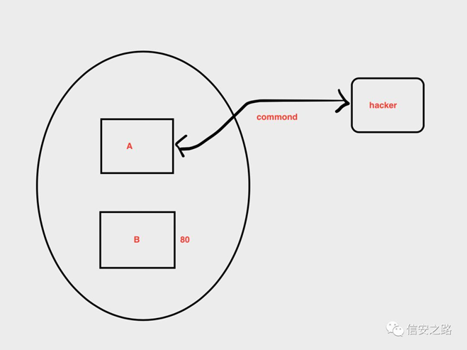 顾名思义,就是将端口进行转发,具体哪个端口转发到哪个端口要以应用场景为准,比如我们拿到一台内外服务器 A 的权限,通过扫描发现了同内网的另一台服务器 B 且开了 80 端口,我们该如何使用浏览器访问它呢?我们拿信安之路的图如下: