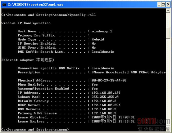 在被控制计算机上开启远程终端,然后执行“ipconfig /all”命令,查看其网络配置情况,如图1所示,该计算机的ip地址为“192.168.80.129”
