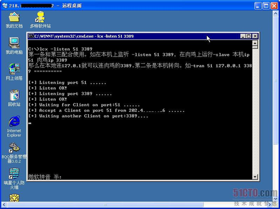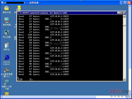 在本机上打开DOS命令提示符,然后到lcx.exe程序所在路径执行“lcx –lister 51 3389”命令,监听51端口,监听成功后,会显示如图3所示的数据。