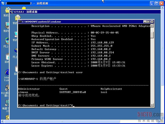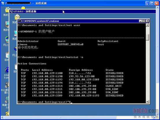 在DOS提示符下输入“mstsc”命令打开远程终端连接器,输入“127.0.0.1”后单击“连接”按钮进行远程终端连接,在出现登录界面后分别收入用户名和密码,验证通过后,即可远程进入被控制计算机的桌面,如图5所示,输入“ipconfig /all”以及“net user”命令来查看网络配置情况以及用户信息。