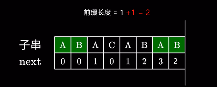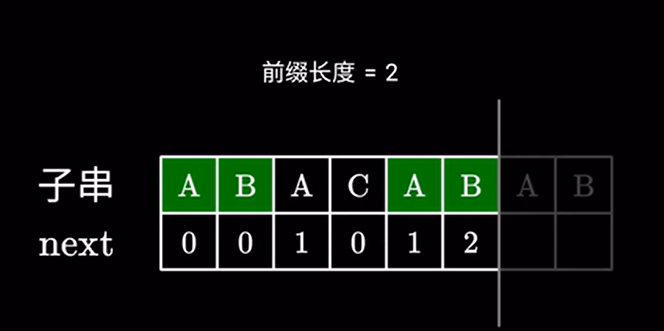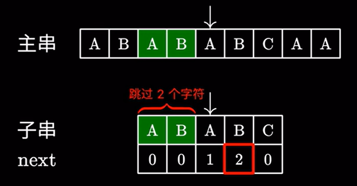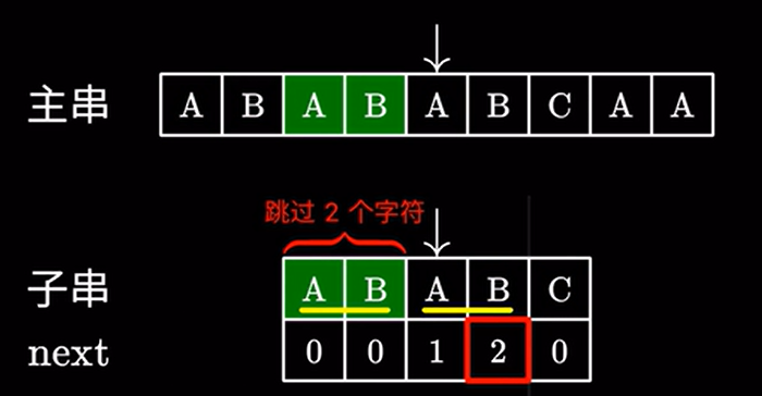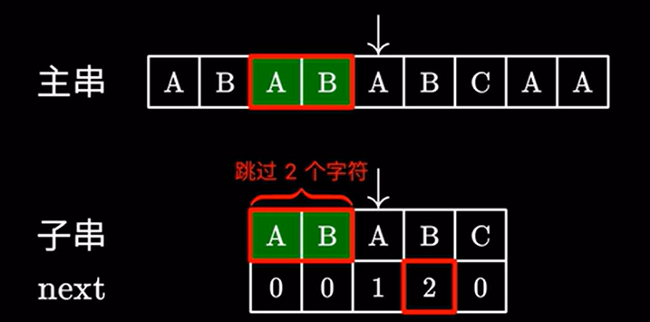 这里 \(2\) 代表子串中我们可以跳过的字符,也就是说前面的这个 \(AB\) 不需要看了,直接进行下一步匹配: