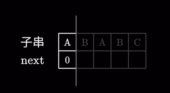 我们还是用刚才的例子来解释,很显然对于第一个字符肯定不存在比他还短的前后缀,next 值直接为 \(0\)