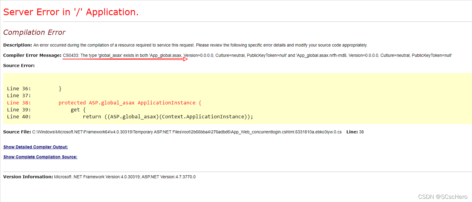 近日遇到一个部署的问题,如图如详细信息,主要异常错误为:CS0433. The type 'global_asax exists in both 'App_global.asax, Version=0.0.0.0, Culture=neutral, PublicKeyToken=nulrl and 'App_global.asax nfth-md8, Version=0.0.0.0, Culture=neutral, PublicKey Token=null'。看提示似乎是已经存在了一个.asax文件因此导致的。