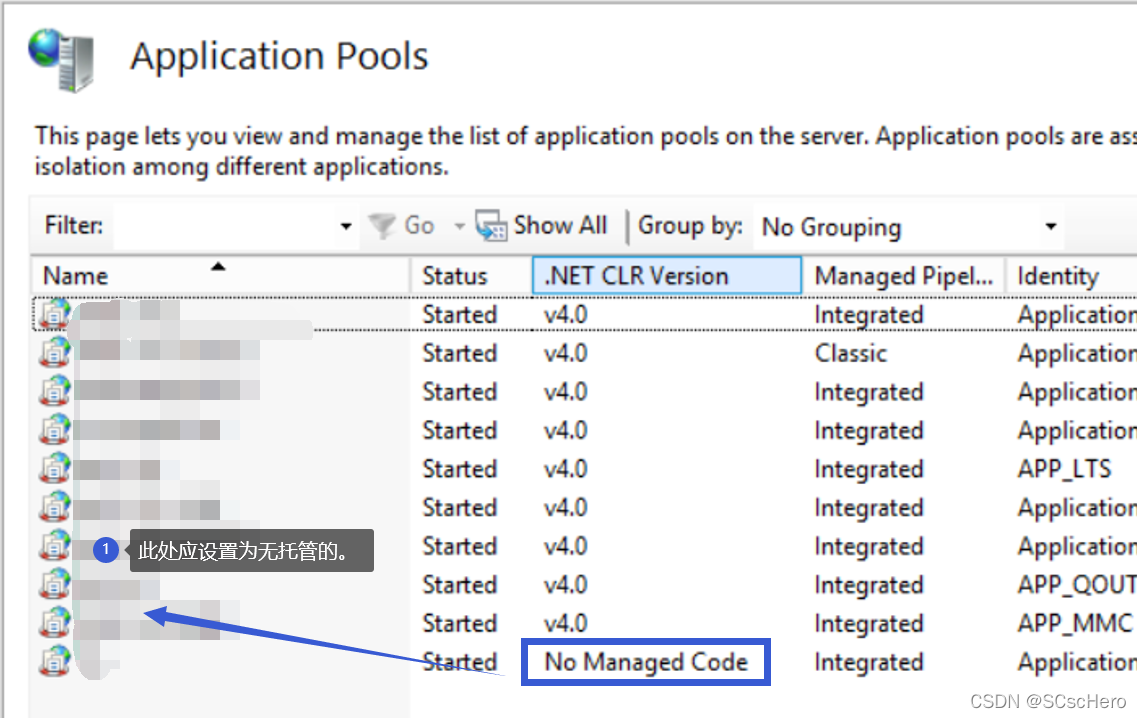- 检查了应用程序池,Restart一下报了错,怀疑是内存泄漏或者是资源问题。后来又Check了下.NET CLR Version,发现成了" v4.0",可能是被人动过?或者是应用程序池自动改的?将其设置为"No Managed Code"即可正常使用了。