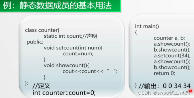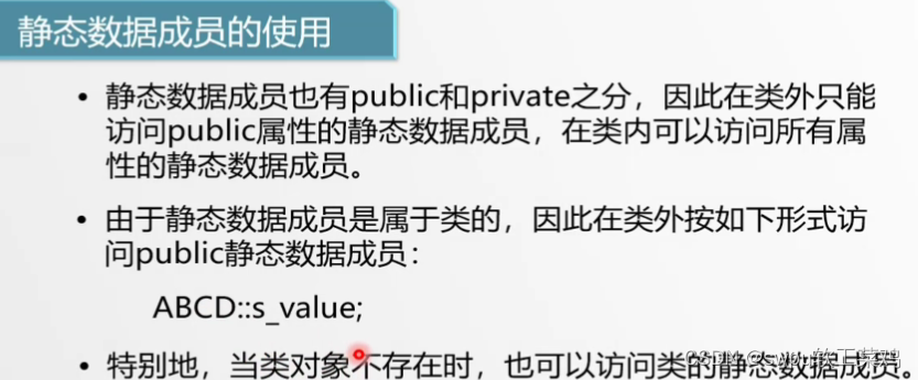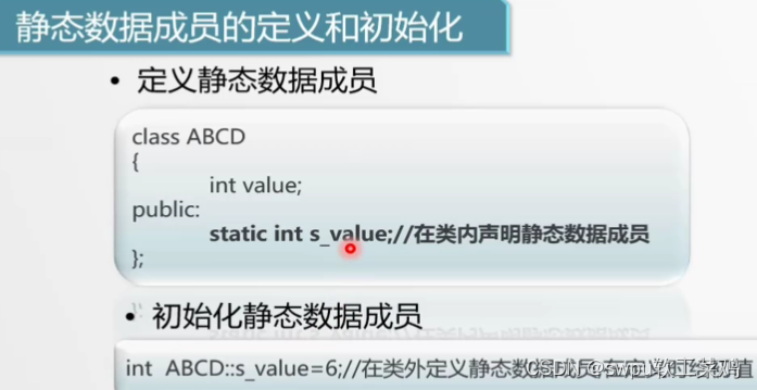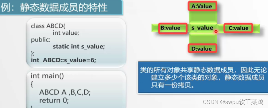 静态数据成员的特性(属于类,不属于类对象):无论调用多少次 静态数据成员在类的所有对象都共享同一片存储空间 例子:int s_value 是所有类对象共享的同一片空间