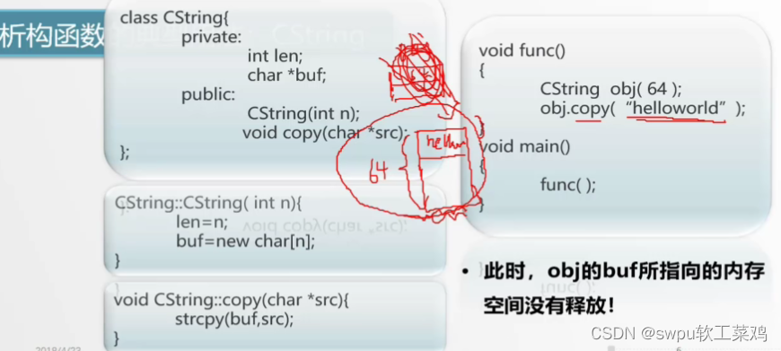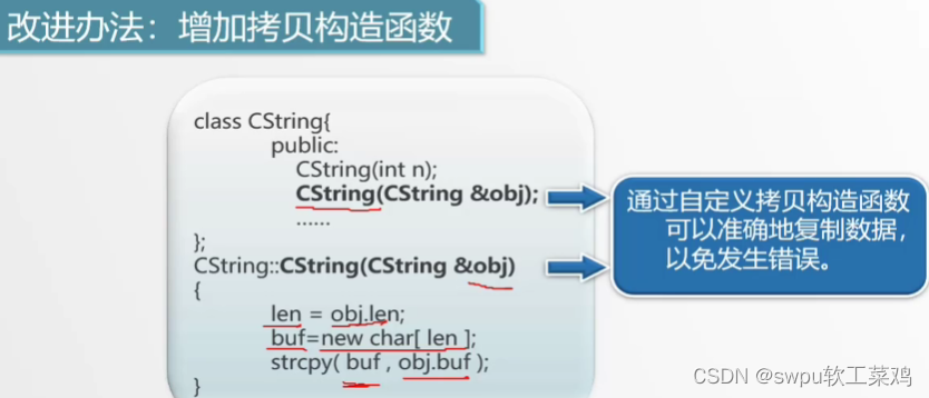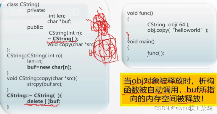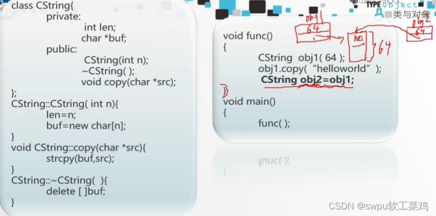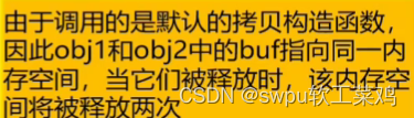 修改方案:让obj1obj2两个类对象的buf指针各自指向各自,都指向独立空间 释放的时候释放的是自己所指向的空间 就能解决这个问题