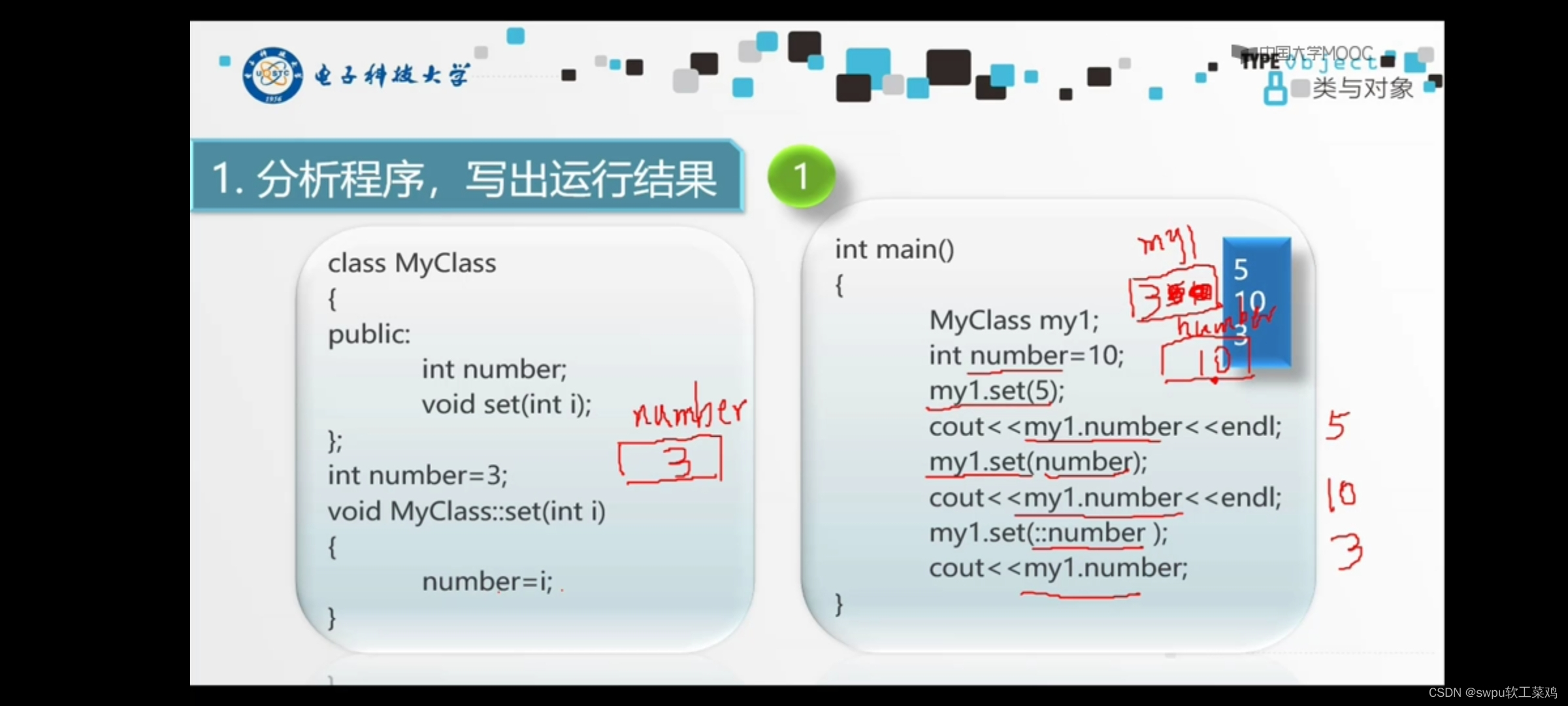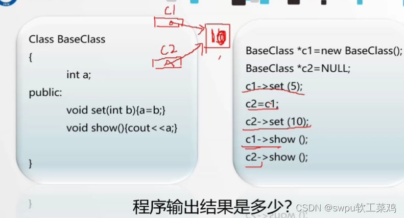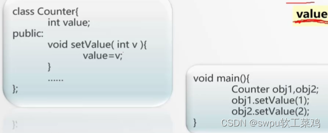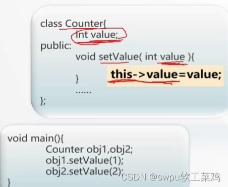 void setValue(int value) 此函数作用是用形参value设置setvalue初始化成员value 但是由于形参value同名的形参覆盖了成员数据value 形参value自己赋值给自己 所以成员数据value并没有修改为了用形参改变类对象的value 用this->value