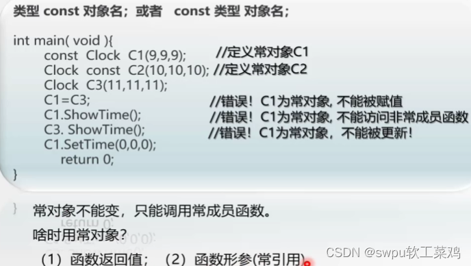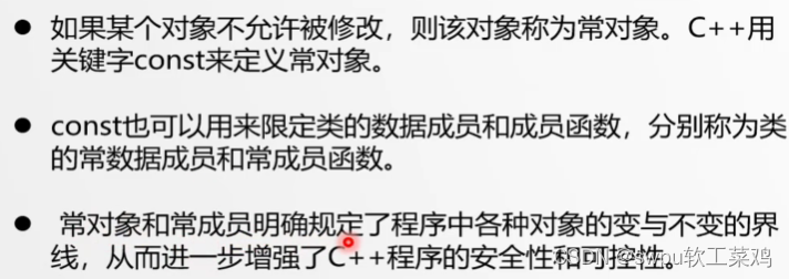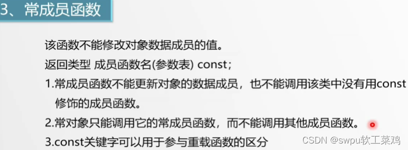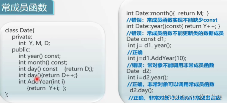 不能通过常成员函数 更新对象的数据成员 也不能调用 没有被const的成员是不能被调用的