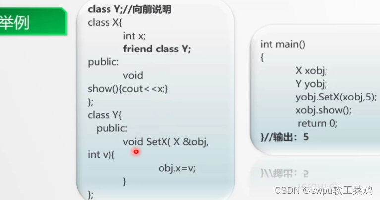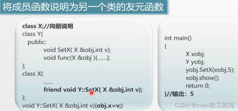 因为X只声明了Y::SetX 函数是X的友元 所以这个函数可以随便访问X类对象的私有数据