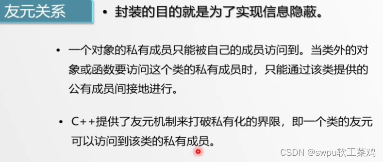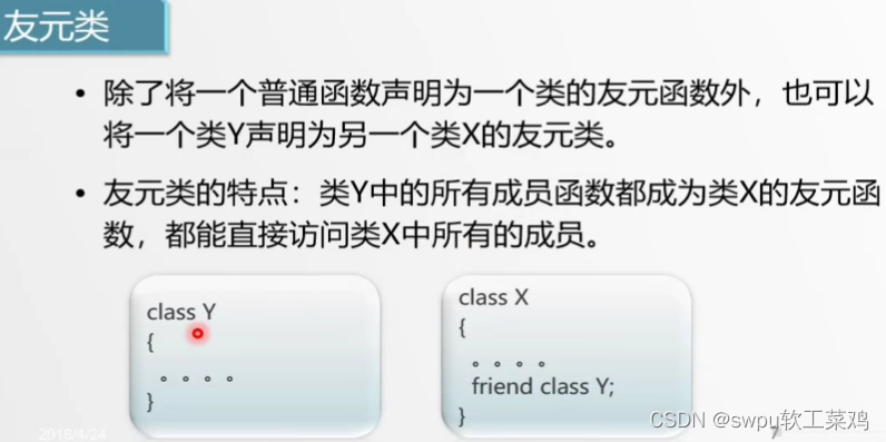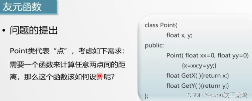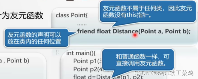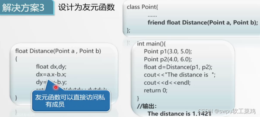 关键字 friend 声明朋友后 Distence这个函数就可以访问所有Point类对象的私有共有成员 所有成员