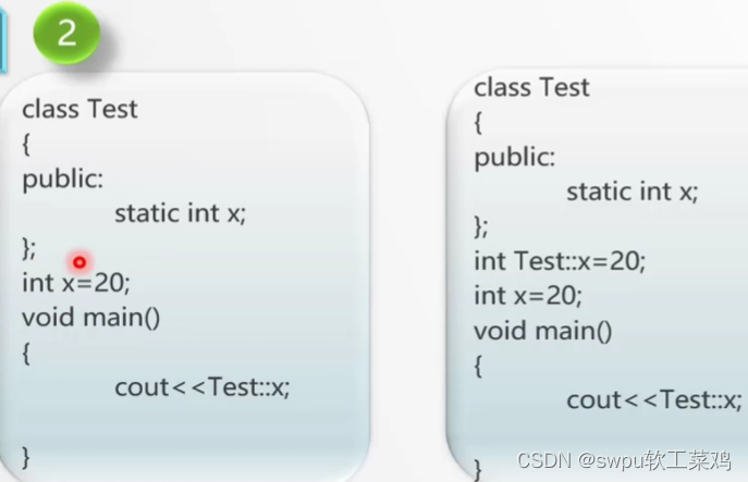 对静态数据 必须在类的外部进行初始化和定义 int Test::x=20; 而int x=20是全局变量x
