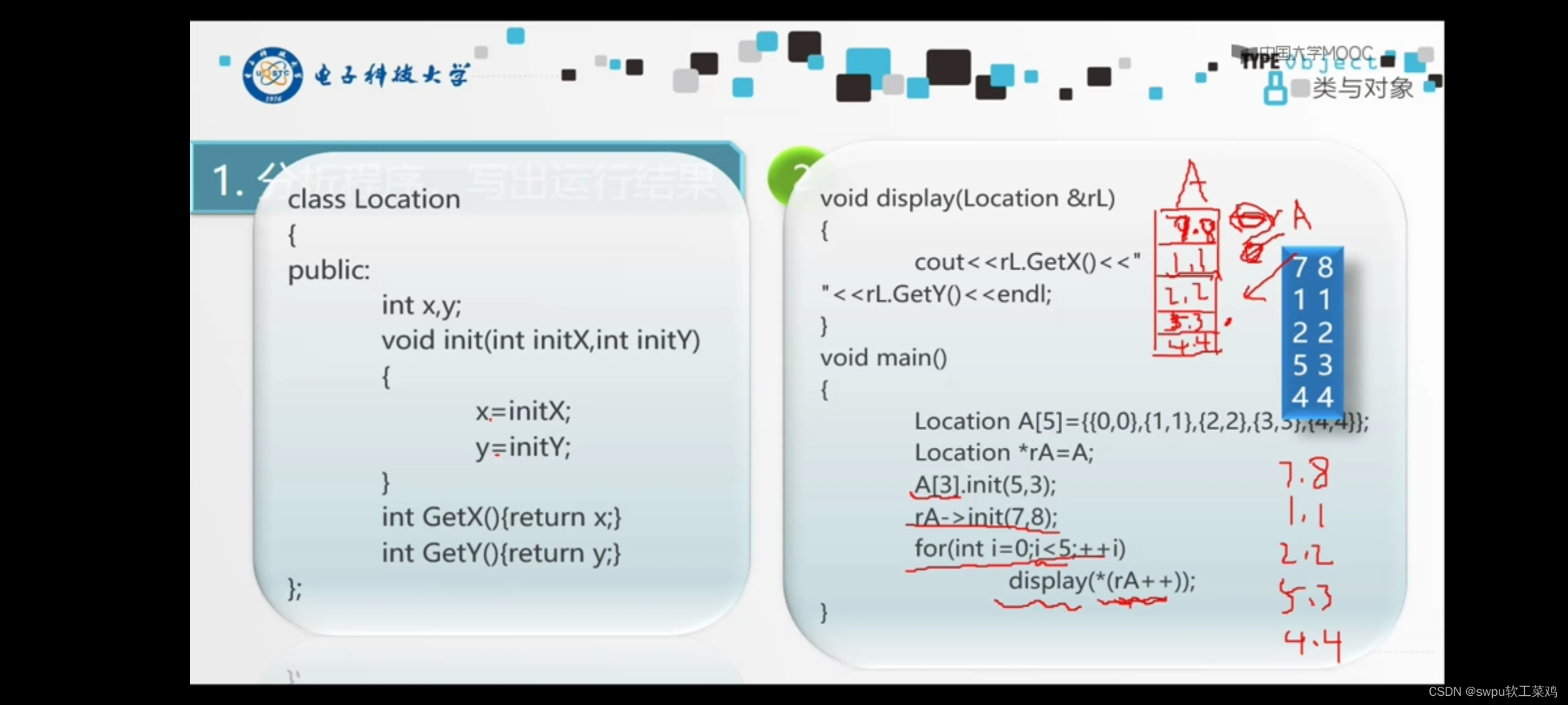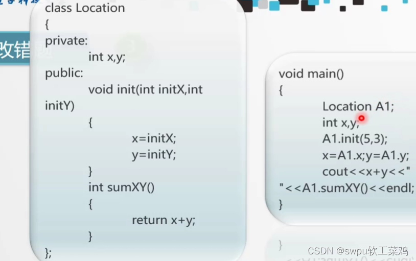 ③A1的私有对象x,y不能在类的外部被访问到 最简单的解决 是把私有改成共有;但是不太好对 面向对象 来说; 或增加两个共有成员函数 分别获取x=A1.x,y=A1.y;但是代码量大