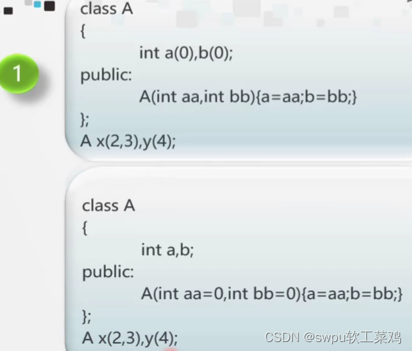 ① 类定义本身有问题 对私有数据初始化 通过构造函数进行初始化 ;不能像普通变量一样 定义变量同时用初始化链表初始化int a(0),b(0) <-错的;初始化链表可以但一定要通过构造函数 ; 第二点 x有两个参数,y有一个参数 也就是说 希望A的构造函数的参数 可以有缺省参数0; 修改类的定义 私有数据int a,b 构造函数aa,bb,有缺省值=0; 类对象x,y y的值是(a=4.b=0)