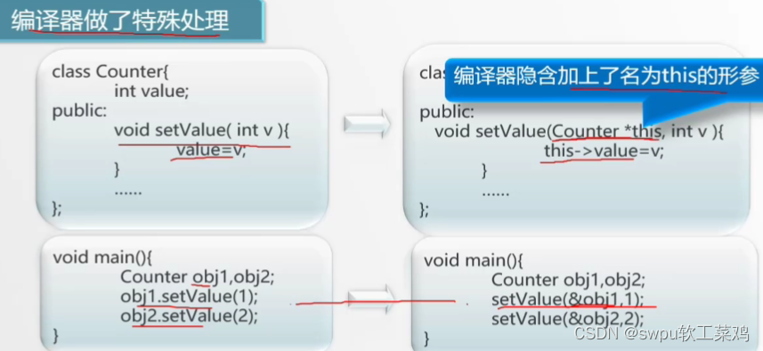 this指针不能显示声明,它只是非静态成员函数的一个形参 右边是编译器的处理 把隐式this翻译