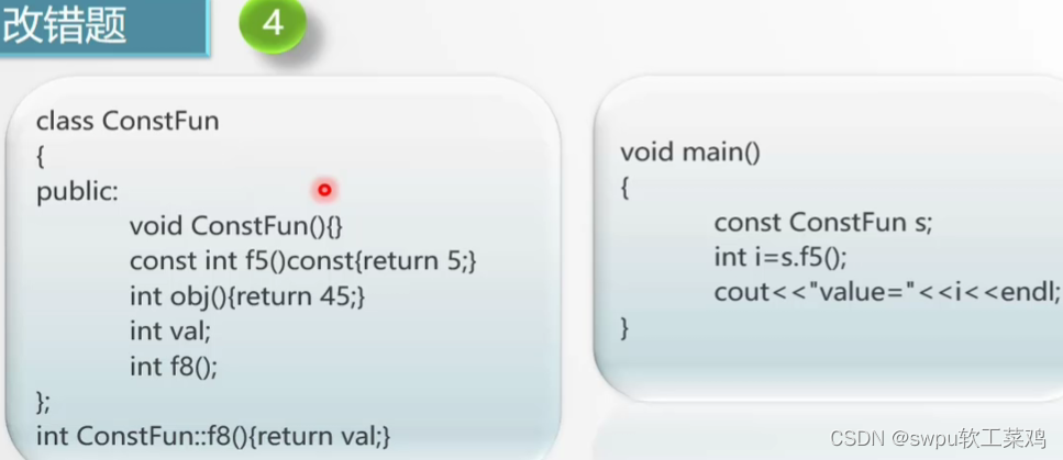 const int f5()const{return 5;} ()后的const表示常函数f5 前面的const表示返回的是常数据5;