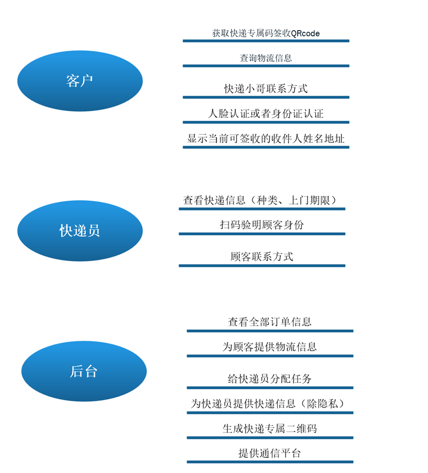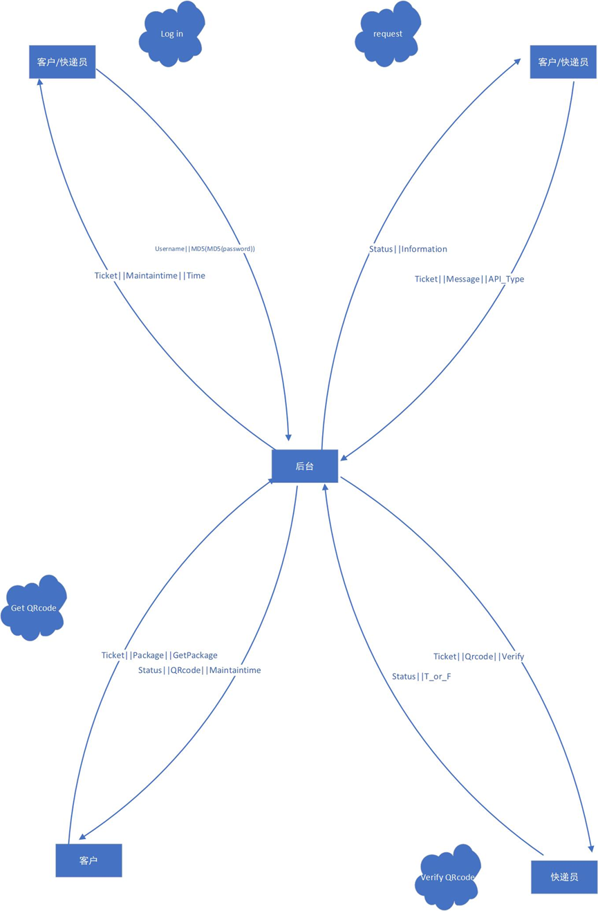 其中Status为后台状态,标记后台是否正常处理了客户端的信息,Information为客户/快递小哥需获得的各类信息,Message为客户端/快递小哥端向服务器发送的信息,API_Type标记着请求的接口类型。无论是快递小哥端查看订单信息、验证身份、确认派送完成,还是客户端查看订单信息、获取取件二维码、签收提醒均遵循上面请求流程,区别仅在于Message和API_Type不同。