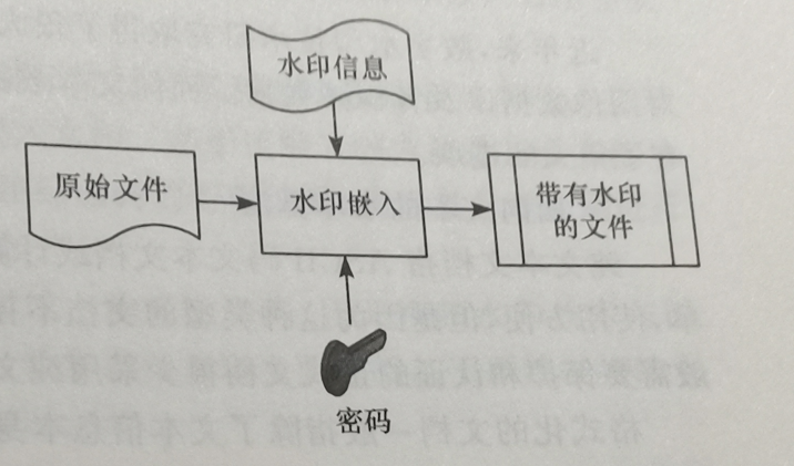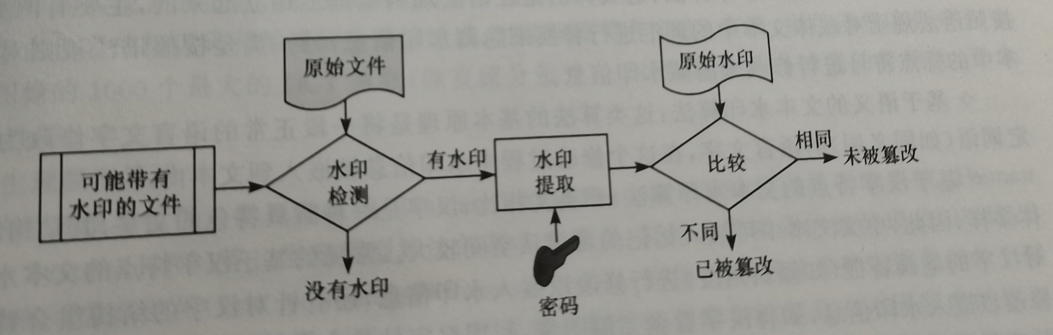向正版软件中利用密码注入水印。对欲使用软件进行水印检测,提取出水印,利用密码进行提取,与原始水印比较,相同说明为正版软件,未被篡改;反之为盗版。