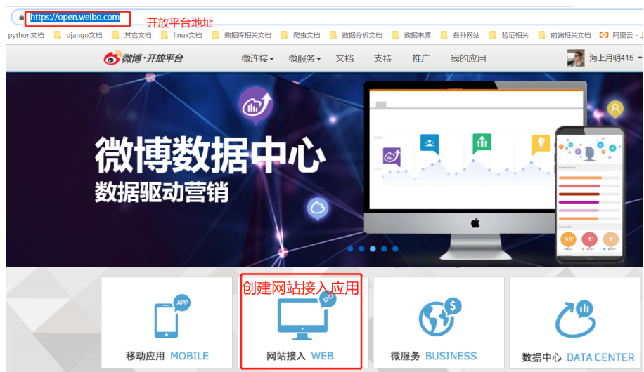 进入首页。创建网站接入的应用: https://open.weibo.com/