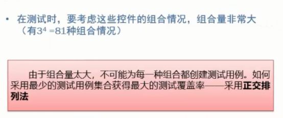 应用场景:在一个界面中有多个控件,每个控件有多个取值,控件之间可以相互组合,不可能(也没有必要)为每一种组合编写一条用例,如何使用最少最优的组合进行测试。——正交排列法