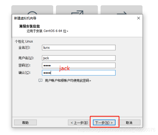 5:设置全名,用户名,密码(用户名和密码要记住,登录的时候会用,我这边全设置为jack)